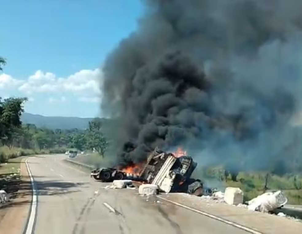 A primeira carreta carregada com algodão tombou na pista e parte da carga pegou fogo. Logo depois, outros dois caminhões pararam lado a lado na rodovia para não atingirem a carga, quando outro veículo atingiu a traseira das duas carretas paradas.