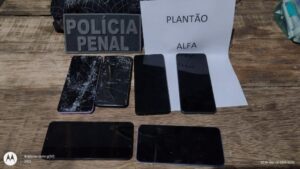 Na Penitenciária Central do Estado (PCE), em Cuiabá, a Polícia Penal realizou duas ações, sendo uma no Raio 05 que resultou na apreensão de 23 smartphones e 65 porções de entorpecentes, além de carregadores. Um dos aparelhos foi encontrado na cela onde um reeducando líder de grupo criminoso cumpre pena.