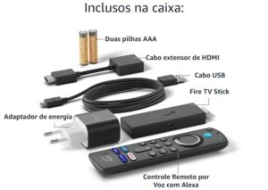 Ambas as versões do Fire TV Stick vão acompanhados de um cabo USB, extensor de HDMI e controle remoto com microfone para acessar as funcionalidades da Alexa.
