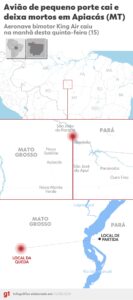 Ao g1, a Polícia Militar confirmou que a queda do avião ocorreu em uma fazenda, localizada na zona rural do município, perto do Rio Teles Pires, em uma região conhecida como “Paredão”. No local, não foi encontrado nenhum sobrevivente, segundo a PM. Até por volta de 12h40 a informação era de que os policiais localizaram apenas dois corpos, ambos carbonizados e sem identificação.