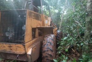 Durante patrulhamento tático em decorrência da Operação Tolerância Zero, as equipes flagraram dois homens extraindo toras de madeira, sem identificação, com apoio de uma máquina pá carregadeira.