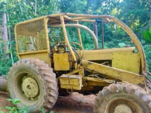 Os militares seguiram o ponto de geolocalização e foram até a região, onde encontraram alguns troncos de madeira cortados e um suspeito utilizando um trator para derrubar uma árvore.