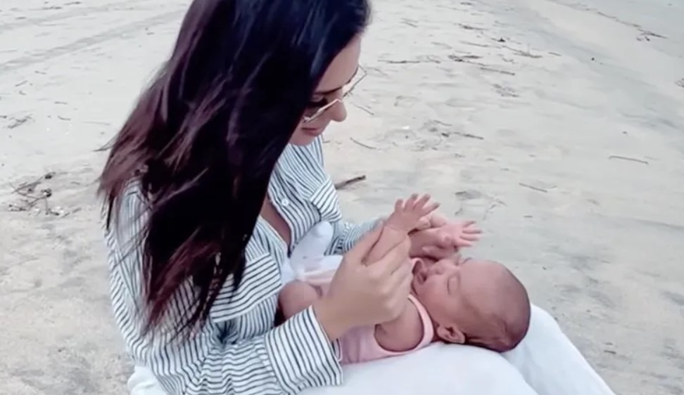 A influenciadora digital, que teve recentemente a primeira filha com Neymar, postou vídeo na web em que aparece babando a pequena, sentada na areia da praia, à beira-mar.