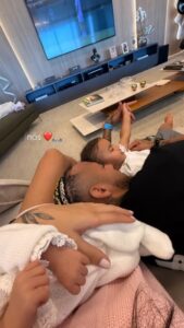 A influenciadora Bruna Biancardi, de 31 anos de idade, postou uma foto nas redes sociais nesta terça-feira, 15, ao lado do marido, Neymar, de 33 anos, e as duas filhas do casal, Mavie, de 1 ano, e Mel, de 11 dias.