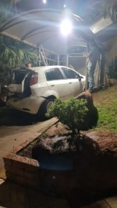 Com o impacto da batida, o veículo de passeio bateu no portão de um prédio e parou dentro do condomínio.