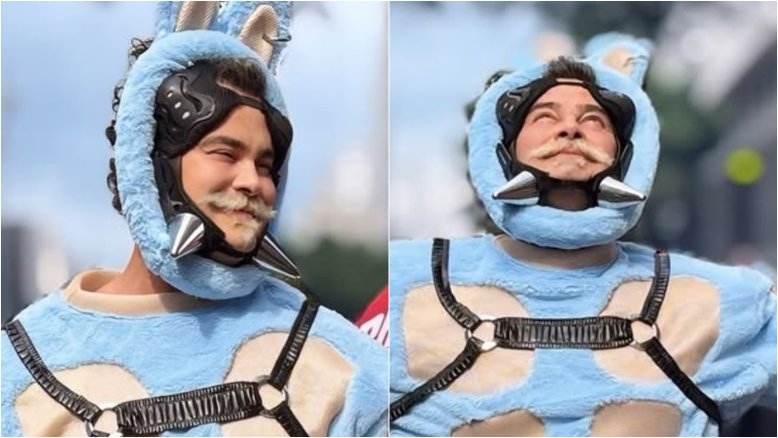 O ator surgiu com bumbum de fora com roupa de coelhinho azul que sugere um personagem musculoso e faz referência a Labubu, da série de brinquedos “The Monsters”. Em cliques publicados no Feed do Instagram, Dalla Vecchia aparece sorrindo e festejando.