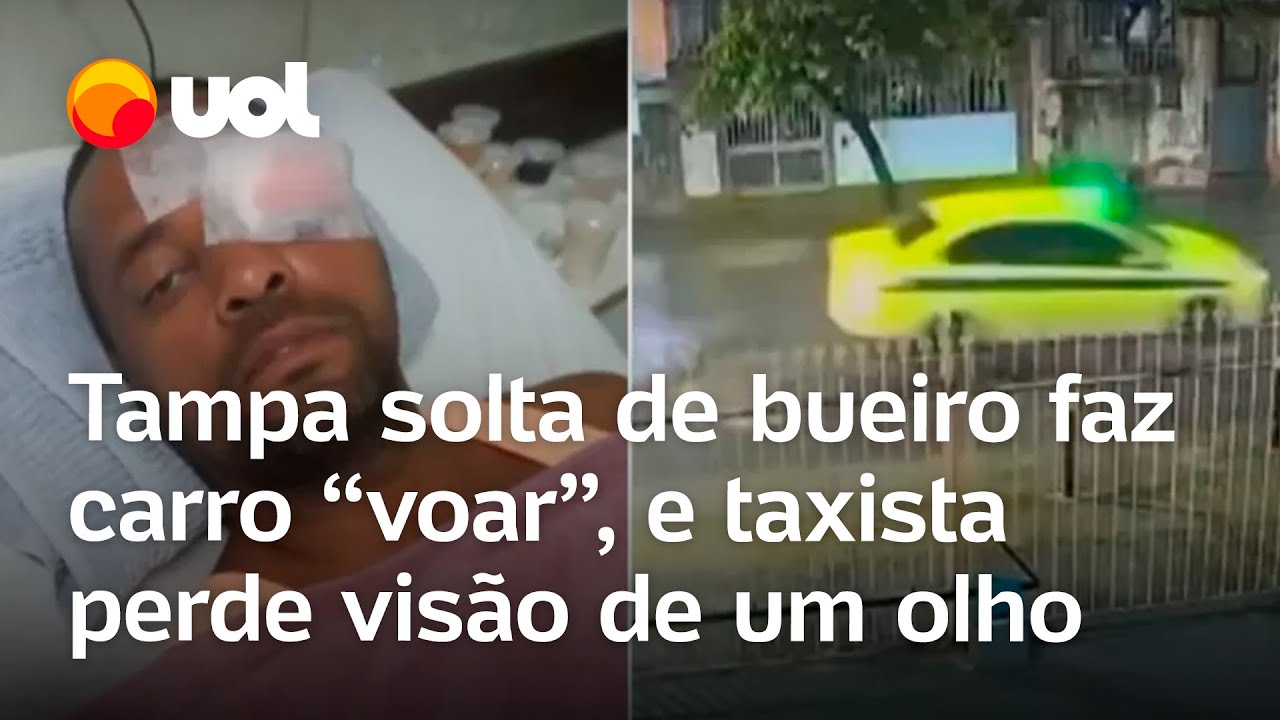 Tampa solta de bueiro faz carro ‘voar’, e taxista perde a visão de um olho no Rio