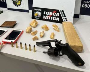 Os outros dois criminosos, um homem e uma mulher, foram detidos no mesmo local. Com a dupla, foi apreendido uma arma de fogo calibre .357 e porções de pasta base de cocaína. Diante dos fatos, os suspeitos foram encaminhados para a Delegacia da cidade, junto com o material apreendido, para registro da ocorrência e demais providências cabíveis.