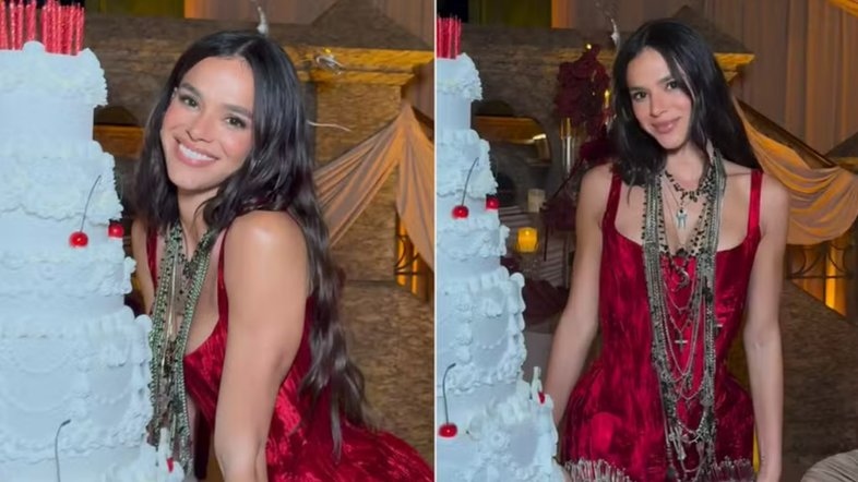 Para celebrar os 30 anos, Bruna Marquezine escolheu um vestido transparente repleto de pedrarias para chegar ao local. Durante a festa, a atriz escolheu um modelo vermelho vivo, com colar de muitas correntes e pegada burlesca, e posou sorridente ao lado do bolo de aniversário, com cinco andares.
