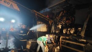 Após o controle do incêndio, os bombeiros realizaram o rescaldo para eliminar focos remanescentes.