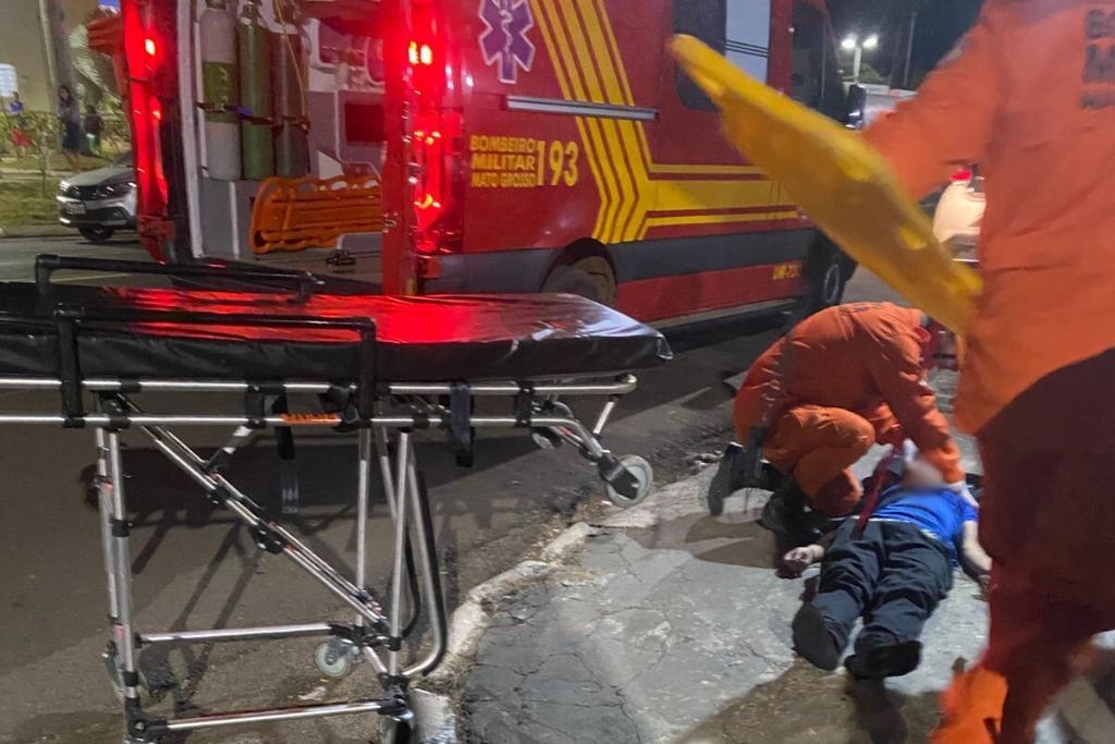 Ao chegar ao local, a equipe do 1º Núcleo Bombeiro Militar (1º NBM) encontrou o condutor da motocicleta caído ao solo, consciente e orientado, apresentando um ferimento na região do queixo e relatando dores generalizadas por todo o corpo.