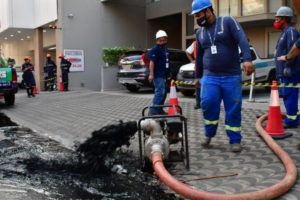 Equipe fez drenagem da água acumulada no subsolo — Foto: Davi Valle/Prefeitura de Cuiabá