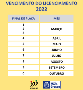 O Departamento Estadual de Trânsito (Detran-MT) divulgou o calendário de pagamento do Licenciamento Anual do veículo para o exercício 2022. O calendário terá início em março e encerra no mês de outubro.