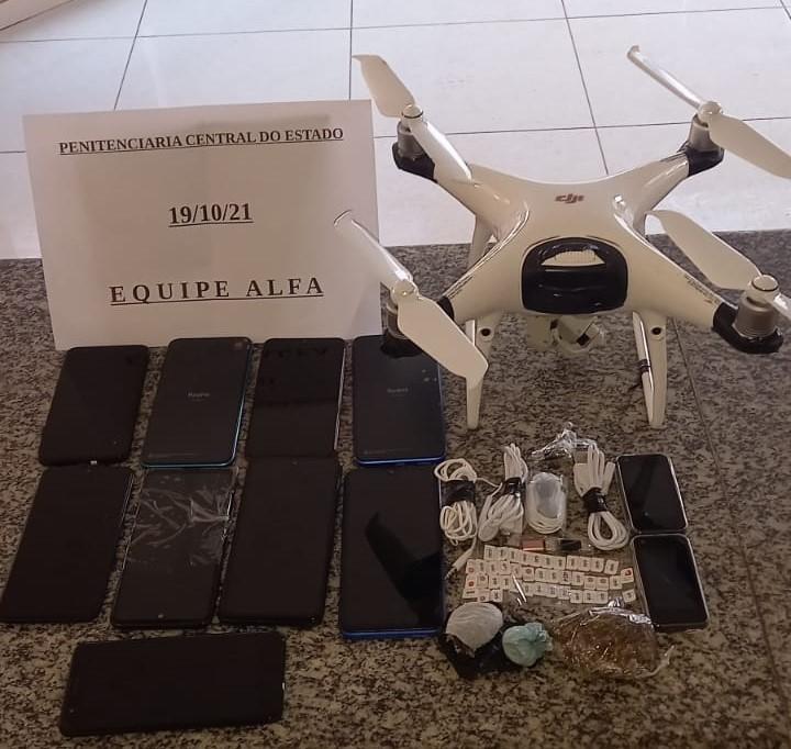 Policiais penais do plantão Alfa da Penitenciária Central do Estado (PCE) apreenderam, na madrugada desta quarta-feira (20.10), um drone contendo celulares, porções de drogas, carregadores, fones de ouvido, chips de celulares, entre outros materiais.