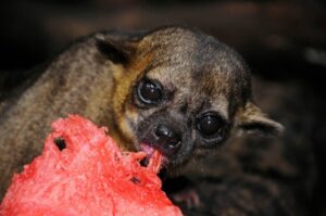 Além de frutas, o jupará se alimenta de néctar, mel, insetos e pequenos vertebrados, como pássaros e roedores.