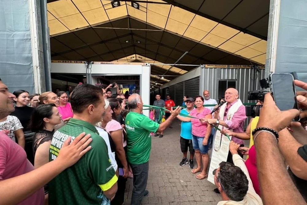A estrutura provisória do Shopping Popular de Cuiabá foi inaugurada neste sábado (14), no estacionamento do local. O espaço conta 600 bancas, distribuídas em 216 contêineres, cada um com três bancas.