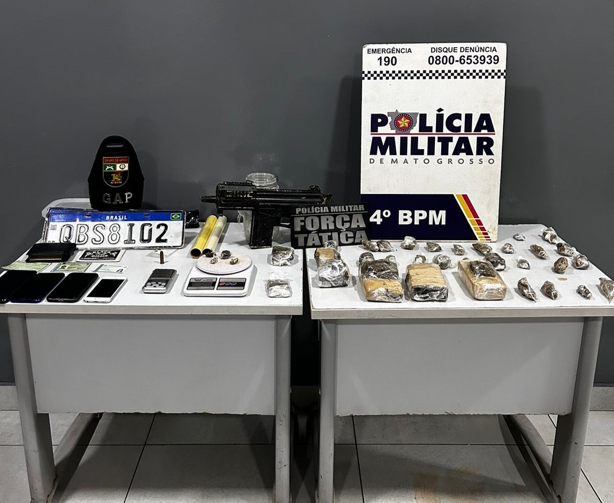 Equipes da Força Tática do 4º Batalhão da Polícia Militar apreenderam, na noite desta quarta-feira (08.05), um simulacro de submetralhadora, 33 porções e outros três tabletes de maconha, quatro aparelhos celulares e uma motocicleta, durante abordagens em Várzea Grande e Cuiabá.