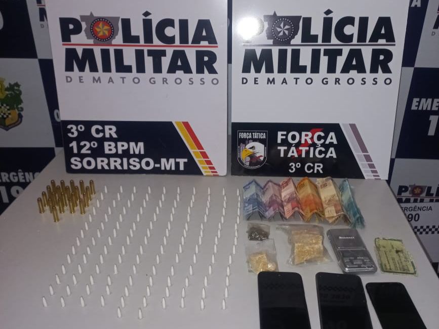 Policiais militares da Força Tática do 3º Comando Regional prenderam dois homens, de 23 e 25 anos, e apreenderam duas adolescentes, de 15 anos, por tráfico ilícito de drogas, na noite desta quinta-feira (12.12), em Sorriso. Com a quadrilha, três pedras de pasta base, 142 pinos de cocaína, munições e R$ 1.413,00 foram apreendidos.