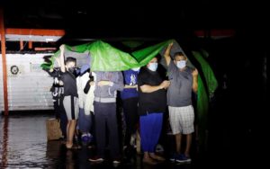 Moradores amontoados na chuva, segurando crianças pequenas ou animais de estimação, estavam preocupados demais para voltar para suas casas no escuro.