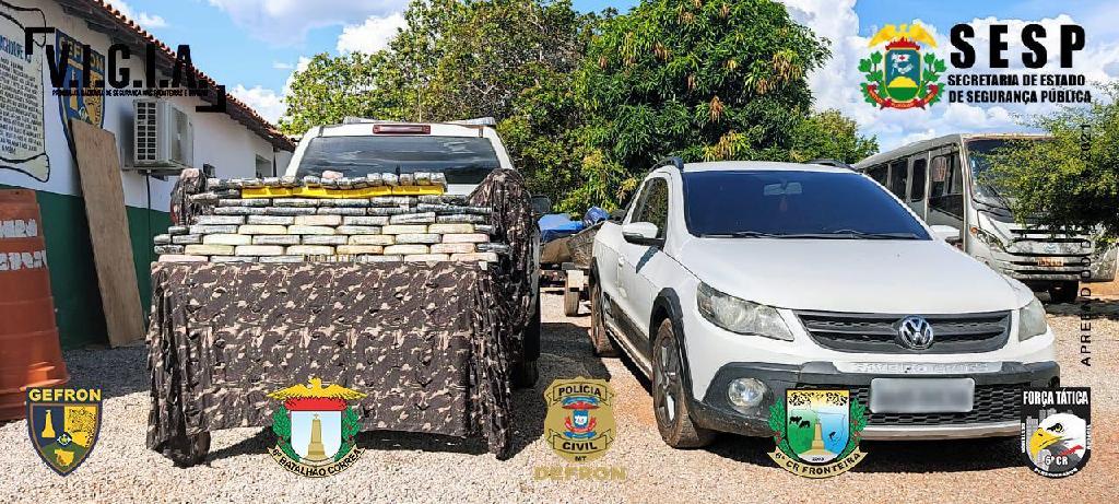 Posteriormente, os policiais deslocaram para fazer a abordagem e mais à frente se depararam com a motocicleta na saída de uma estrada vicinal, denominada “Cabriteira”, juntamente com uma caminhonete Triton L200 de cor prata. Ao avistar a viatura, o motorista do carro fugiu sentido Bolívia. Após um trecho em perseguição, o o suspeito abandonou o veículo e adentrou em uma área de mata. Os policiais fizeram uma varredura no local, mas não conseguiram localizá-lo.