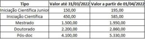 O reajuste beneficiará um total de 700 bolsistas que recebe bolsas de formação de Recursos Humanos, Iniciação Científica Jr. (ICJr.), Iniciação Científica, Graduação (IC, EXT, IT ), Mestrado, Doutorado e Pós-Doutorado.