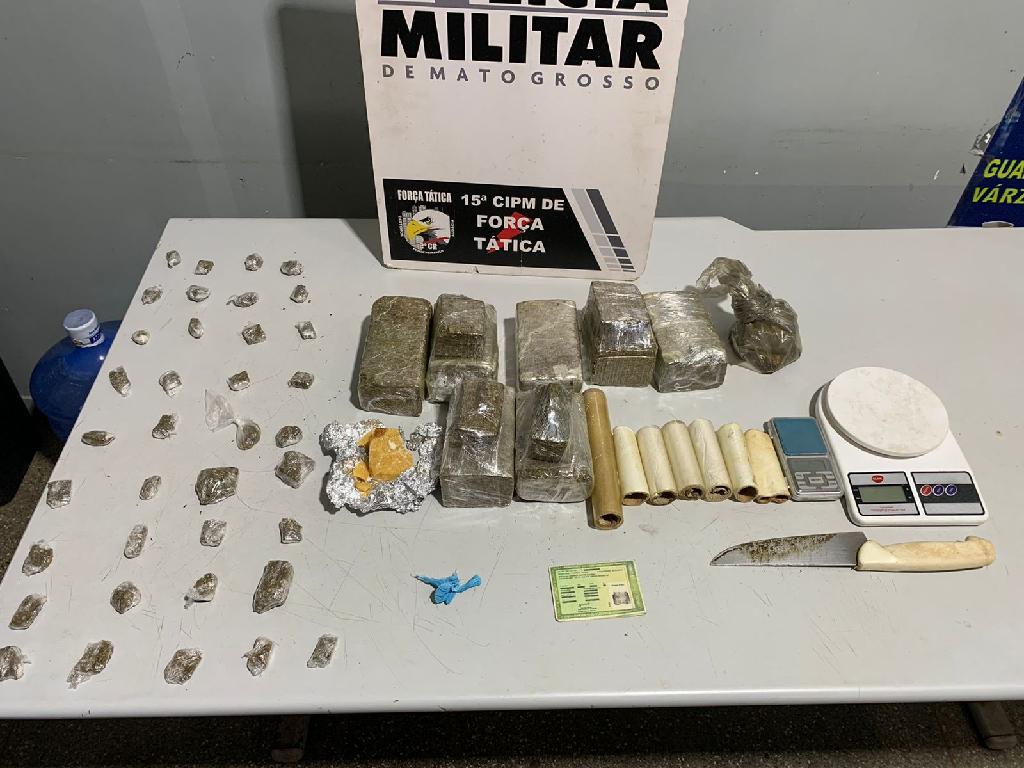 Policiais militares da Força Tática do 2º Comando Regional prenderam em flagrante um homem, de 32 anos, por tráfico de drogas, no final da noite desta quarta-feira (02.03), em Várzea Grande. Com o suspeito, a equipe apreendeu sete tabletes e porções de substância análoga a maconha, além de porções de substância análoga a cocaína.
