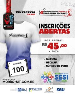 As inscrições para a 4ª Corrida Estadual de Combate ao Trabalho Escravo já estão abertas. O evento, que conta com o apoio da Secretaria de Estado de Segurança Pública (Sesp), acontecerá no dia 8 de junho no Parque Tia Nair, em Cuiabá.