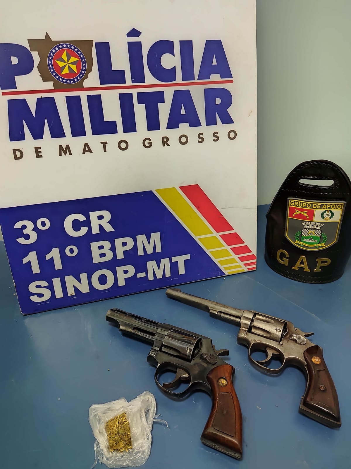 O trio foi visualizado em seguida. Dois deles foram detidos em flagrante, enquanto um terceiro correu para uma região de mata, não sendo localizado até o momento. Os policiais militares realizaram a abordagem dos suspeitos que estavam com um revólver calibre 38 cada. As equipes ainda apreenderam uma porção de maconha, uma motocicleta Honda Biz e outra Honda Tornado.
