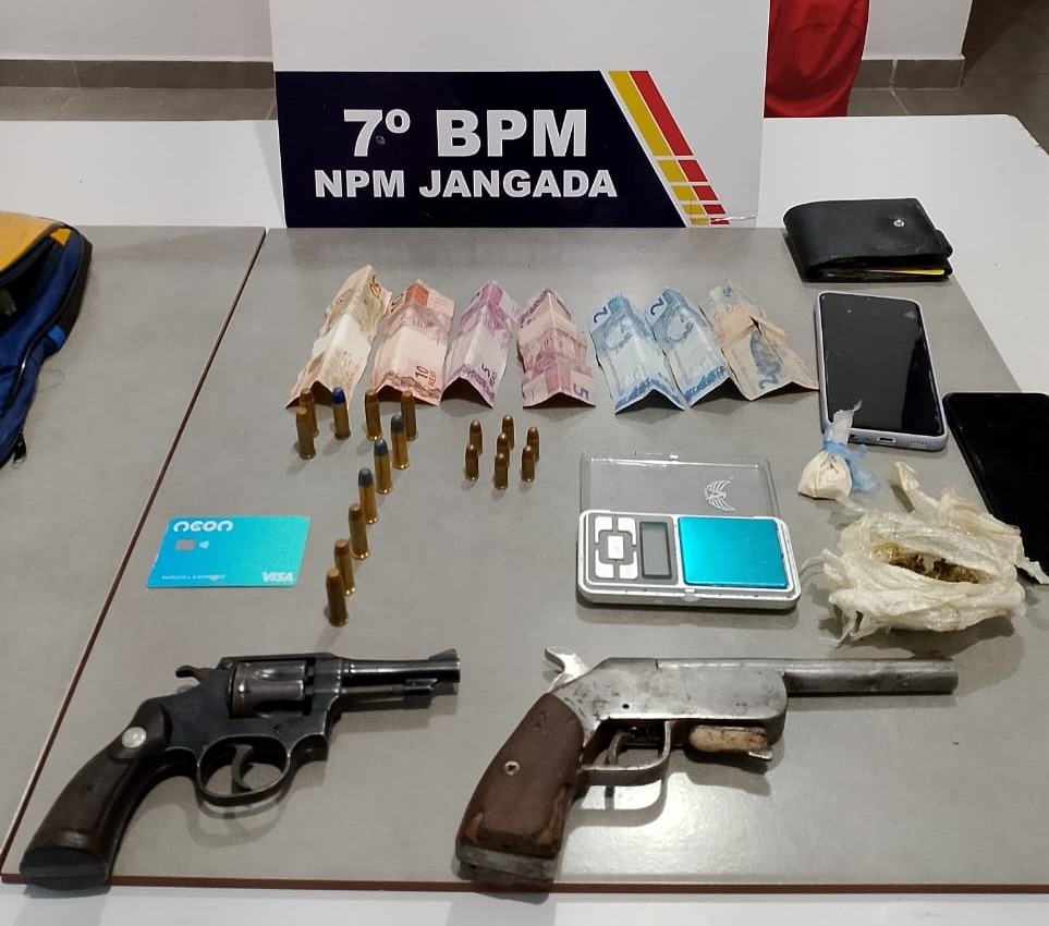Policiais militares do 7º Batalhão apreenderam um revólver calibre .32, uma arma artesanal calibre .38, 18 munições, porções de substância análoga à maconha, balança de precisão e aparelhos celulares.