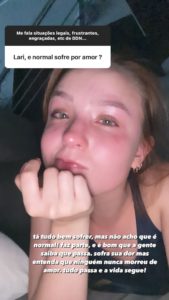 Larissa Manoela passou o Dia dos Namorados de 2021 solteira. Em suas redes sociais, a atriz e cantora aproveitou a data para responder perguntas dos fãs sobre relacionamentos amorosos. Em um dos cliques, ela respondeu uma pessoa que questionou se “era normal sofrer por amor” e Lari postou uma foto em que aparece chorando.