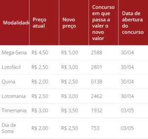 As novas alterações entrarão em vigor a partir de 30 de abril para Lotofácil, Mega-Sena, Quina e Lotomania. A partir de 3 de maio, o reajuste passa a valer também para a Timemania e Dia de Sorte.