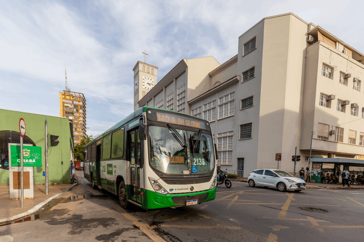 A foto mostra um ônibus circulando na região central de Cuiabá. O veículo é pintado nas cores verde e branca. Ao fundo, está a Catedral Basília Senhor Bom Jesus de Cuiabá.