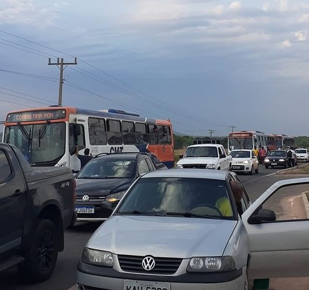 Usuários do transporte coletivo fazem uma manifestação e bloqueio da rodovia MT-040, em Santo Antônio do Leverger, a 35 km de Cuiabá, contra o aumento do preço da passagem das linhas intermunicipais.