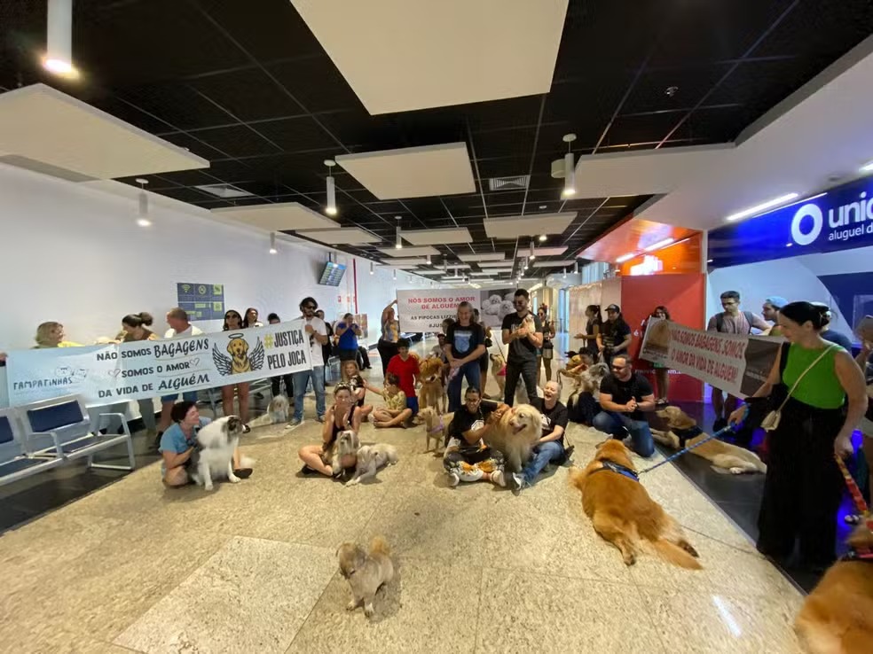 No local, tutores acompanhados de seus cachorros pediram por justiça e seguravam cartazes com os dizeres: “Não somos bagagem. Somos o amor da vida de alguém”.