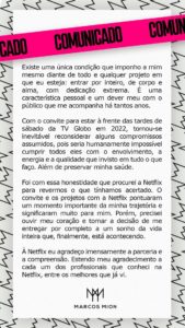Com o convite para estar à frente das tardes de sábado da TV Globo em 2022, tornou-se inevitável reconsiderar alguns compromissos assumidos, pois seria humanamente impossível cumprir todos eles com o envolvimento, a energia e a qualidade que invisto em tudo o que faço. Além de preservar minha saúde.