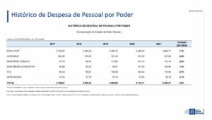 No histórico de despesa de pessoal, por poderes da administração pública, houve um crescimento nos primeiros meses de 2021, sendo equivalente a um total de 6,8% a mais que em 2020, totalizando R$ 4.394 bilhões. O Poder Executivo representou o maior crescimento, ficando em 7,1%, devido a contratação dos profissionais da Educação neste ano, que não ocorreu em 2020, por conta da suspensão das aulas em virtude da pandemia. Os custos de pessoal e encargos sociais que correspondiam a 79,7% em 2020, caíram para 75,9% da despesa total em 2021