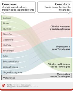 Desde 2022, as disciplinas tradicionais passaram a ser agrupadas em áreas do conhecimento (linguagens, matemática, ciências da natureza e ciências humanas).