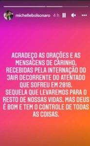 No Instagram, a primeira-dama Michelle mostrou gratidão. “Agradeço as orações e as mensagens de carinho, recebidas pela internação do Jair decorrente do atentado que sofreu em 2018. Sequela que levaremos para o resto de nossas vidas. Mas Deus é bom e tem o controle de todas as coisas”, publicou.