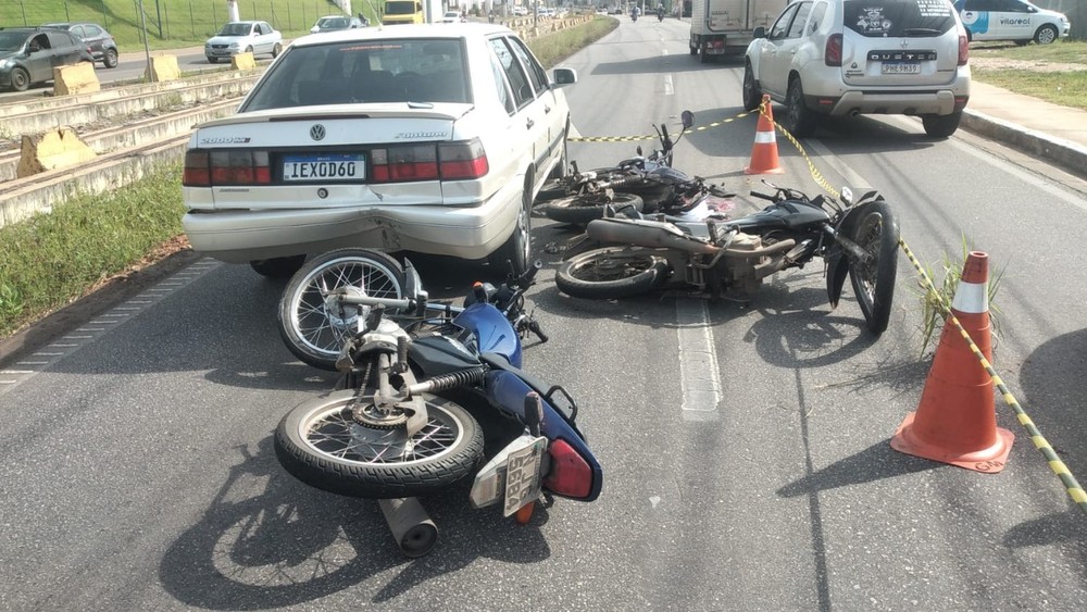 Segundo a Guarda, as três motos envolvidas seguiam pelo corredor e o carro na pista da direita. Já o caminhão saiu da pista da esquerda para a direita, atropelou os motociclistas e bateu no veículo de passeio.