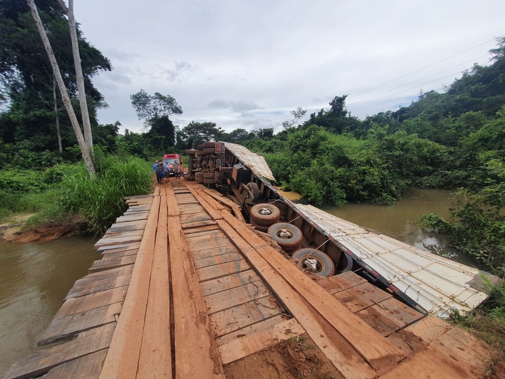 O veículo estava carregado com soja e passava pela ponte de madeira perto da comunidade Alvorada, na zona rural de Alta Floresta. Quando os bombeiros chegaram no local, o motorista já estava do lado de fora.