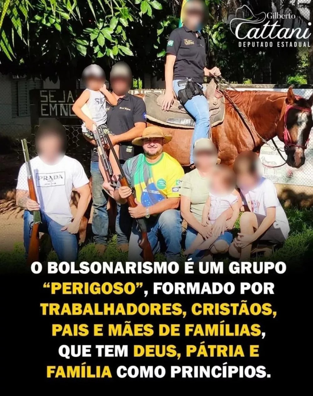 A publicação foi feita em julho. Na foto, Catanni aparece com uma camiseta verde e amarela e com a bandeira do Brasil, segurando uma arma. Ao lado dele, um homem está com uma criança no colo e ela segura outra arma. Um terceiro homem e uma mulher, em cima de um cavalo, também estão armados. Outras crianças também aparecem na foto, inclusive um bebê.