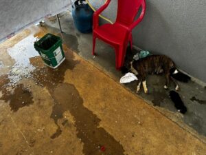 O animal estava em estado de desnutrição, não havendo alimentação adequada ou água para a cachorra, e nem mesmo potes específicos para ela. A cadela se alimentava de arroz jogado no chão e restos de água de poças. Nas mesmas condições estavam cinco filhotes.