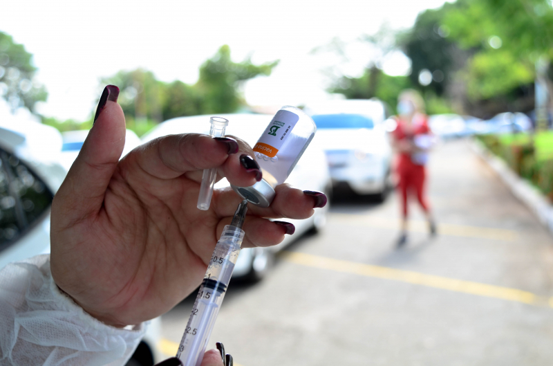 Nos polos da UFMT e Sesi Papa estão sendo imunizados no modelo drive thru. No Sesi está imunizando os idosos de 65 a 69 anos (1ª dose). Já na UFMT está atendendo apenas trabalhadores de saúde com a segunda dose da vacina Coronavac.