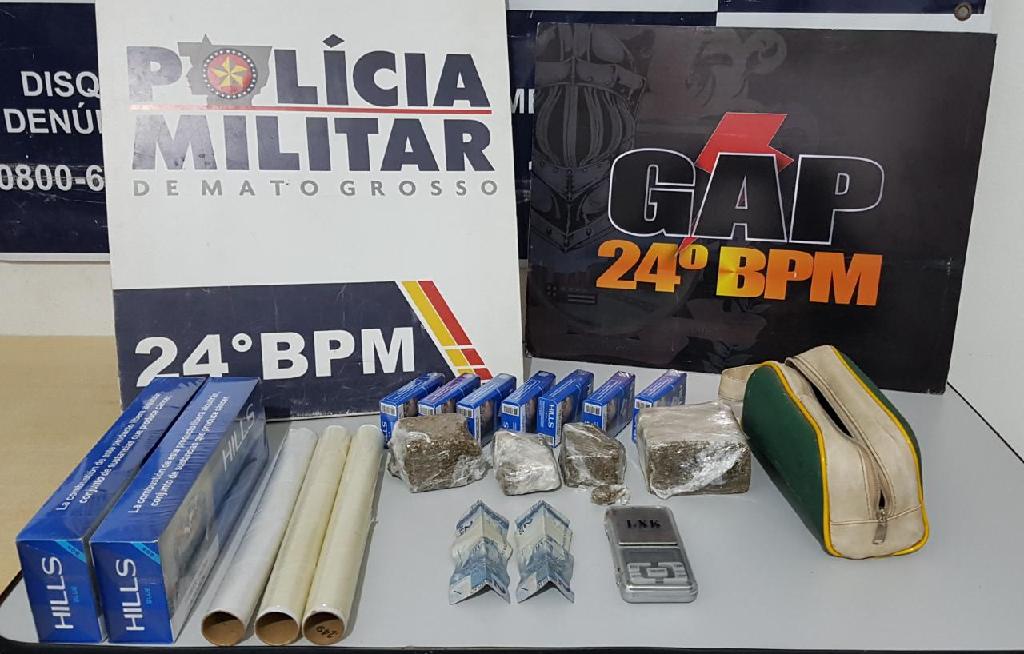 Policiais do 24° Batalhão de Polícia Militar prenderam um suspeito de 34 anos, no bairro São João Del Rey, em Cuiabá, e com ele apreenderam quatro pedaços grandes de maconha, porções pequenas da mesma droga, balança de precisão, papel filme, além de dezenas de carteiras de cigarro.