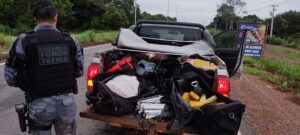 Os policiais da Força Tática e da PRF estavam em barreira, no trevo entre da BR-070 e MT-040, quando viram uma caminhonete Hilux que estava com visível excesso de bagagem na carroceria.