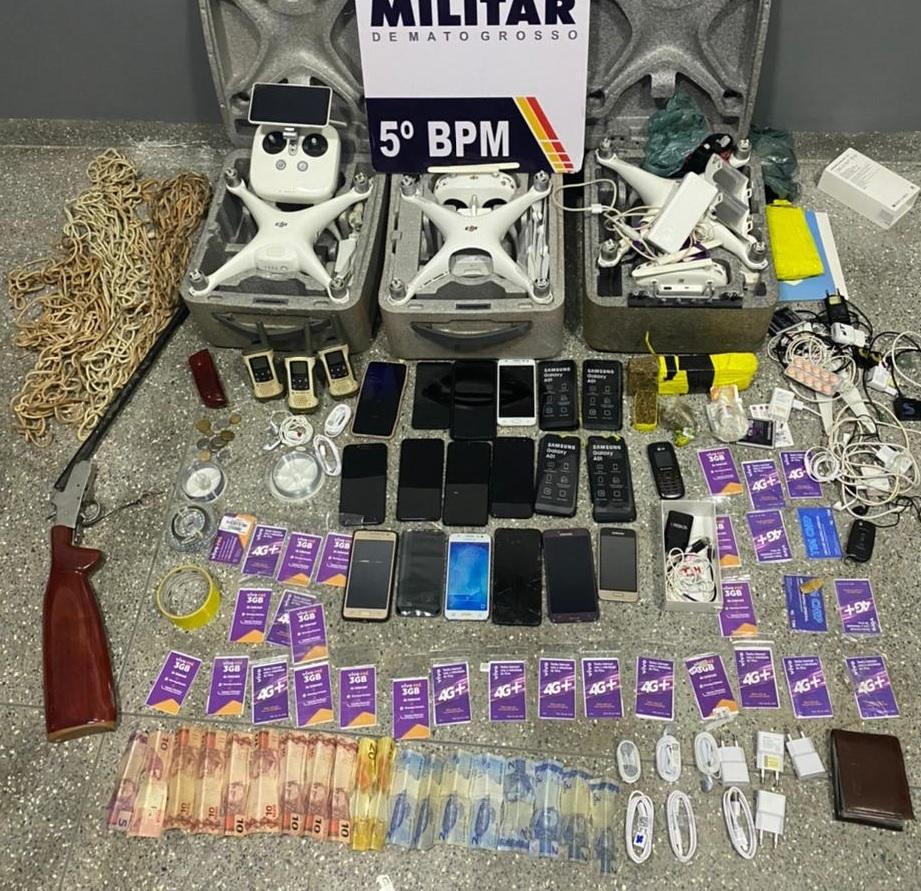 Os militares foram na casa de dois suspeitos. Em uma delas, encontraram mais dois drones e uma espingarda calibre 32. Na outra, vários celulares e chips de celular. Ambos disseram que todo material seria jogado na unidade prisional da cidade.