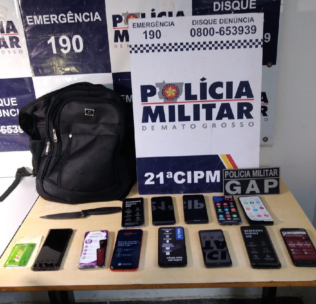 Através do Grupo de Apoio (GAP) do 21º CIPM, no final da tarde desta terça-feira (21.12), a Polícia Militar prendeu dois suspeitos após roubo a uma loja na área central de Cuiabá. Na ação, a PM recuperou 12 aparelhos celulares e apreendeu uma faca, utilizada pelos indivíduos para praticar o crime.