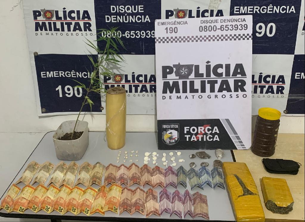 Em patrulhamento tático pelo bairro Liberdade, em Cuiabá, a Força Tática do 20º CIPM visualizou o suspeito, que ao avistar a guarnição dispensou nove porções de pasta base. Na busca pessoal ao indivíduo, os policiais militares encontraram, ainda, cinco porções de maconha e a quantia de R$ 593 em dinheiro. O suspeito relatou aos policiais que o valor seria proveniente do tráfico pela região.