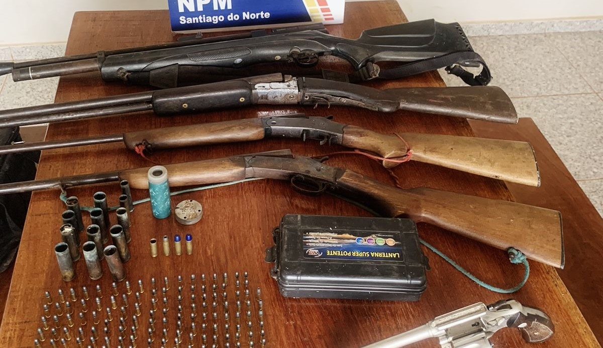 Em diligência, os policiais fizeram buscas pela região. O suspeito foi localizado na propriedade. No local, foram apreendidas três espingardas calibre .20 e .36 com numeração ilegível, um revólver calibre .38, uma carabina de pressão calibre 5.5 e 189 munições calibre .22 intactas.