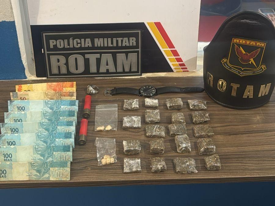 Os policiais também recolheram o material jogado pelo suspeito e encontraram 19 porções de maconha e duas porções de pasta base. O criminoso recebeu voz de prisão em flagrante.